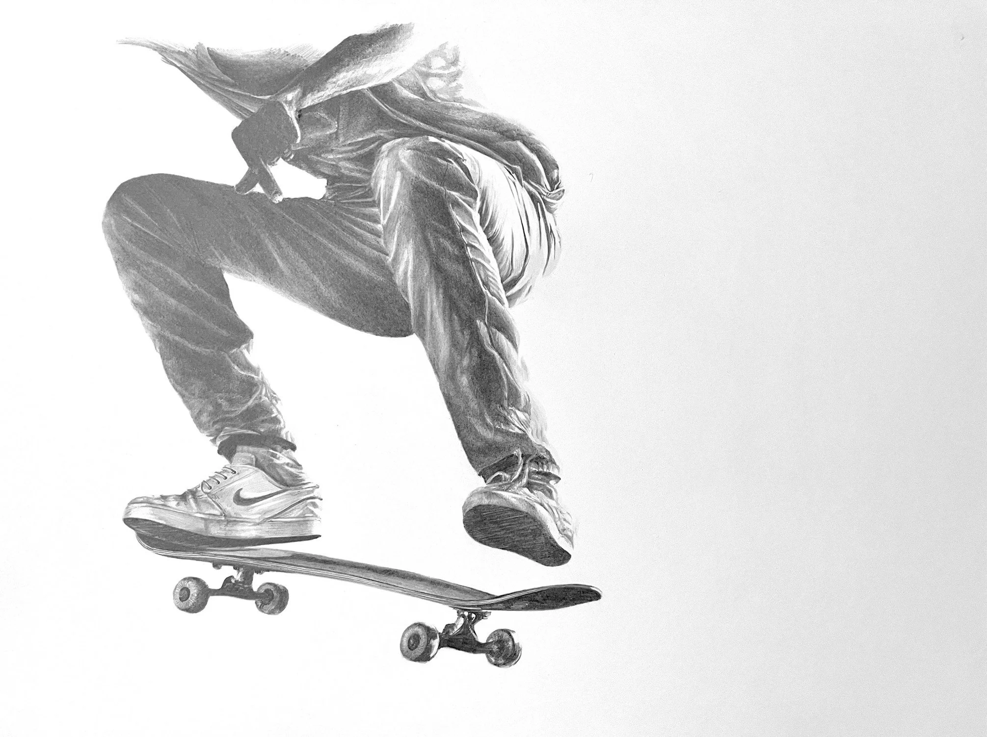 This drawing truly represents what my artwork is all about, the simple yet detailed way that movement is capture in a still image. Lights interaction with the subject in all its detail and a nod to the subject, in this case skateboarding, fashion of that time and photography as a whole.